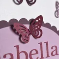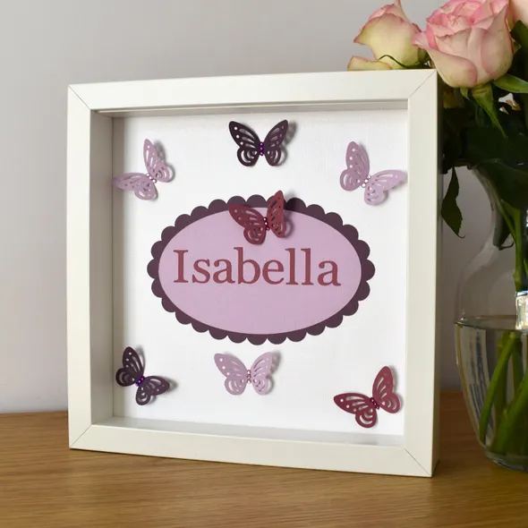 Beautiful sparkling butterflies surround your child's name with this cute personalised girls room decor in the 3 colours of your choice.Can be sent DIRECT if requested. This will be wrapped in tissue paper, but an upgrade can be added for gift wrap, ribbon and a tag.Frame colour options are black, white and oak effect. There is no glass in the frame, it is a Perspex sheet for safety reasons.DUE TO BEING HANDMADE PLEASE ALLOW UP TO 2 WEEKS FOR DISPATCH.PERSONALISED ITEMS ARE NON-RETURNABLE/REFUNDABLE.I can do many other different designs and colours with any wording you wish. Please get in touch if you would like to know more or have a specific design request.Find my other items here.https://www.etsy.com/uk/shop/ElaraEnchantedFind me on Facebook, Instagram and Pinterest too.Thanks for lookingLove & Wishes from Elara Enchanted xx